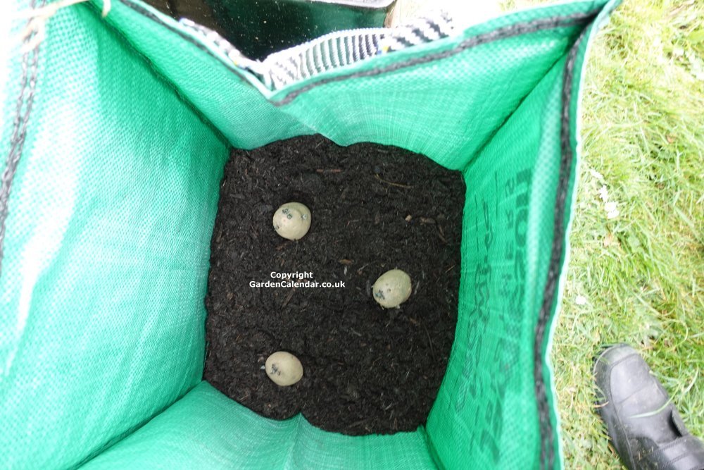 Add more compost over the seed potatoes so that they are covered by 8cm / 4in or so of compost. The compost should be slightly moist but definitely not wet. If it is dry, apply a little water.
