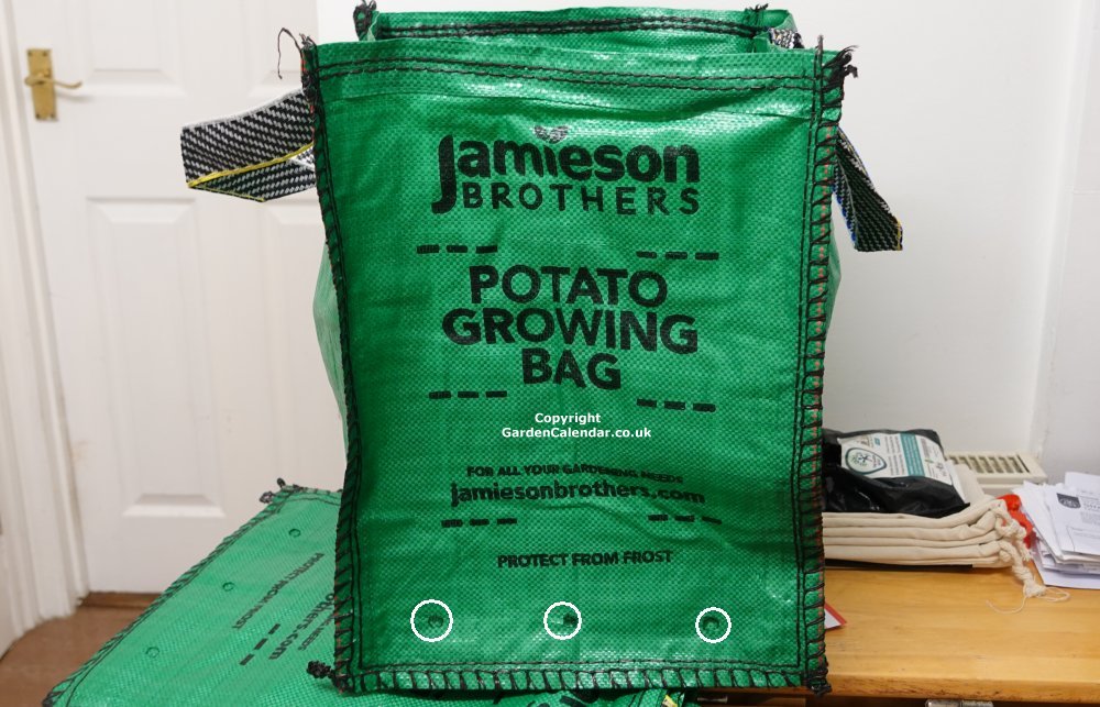 Do ensure that the potato growbag you choose has drainage holes in the base area of the bag. Without drainage, the seed potatoes are at risk of rotting. In the picture below, three drainage holes are highlighted by the three white circles and there are three more on the other side.