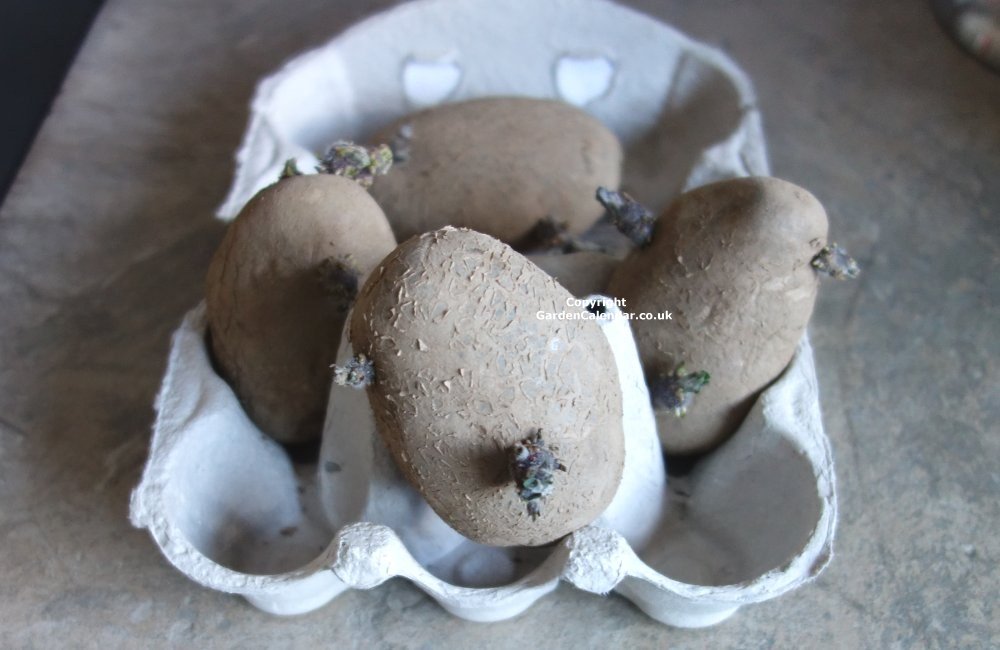 Start the chitting / sprouting process around first week of March in average areas of the UK. which takes four to five weeks. At this stage the sprouted seed potatoes will be ready to plant outside in the container(s).
