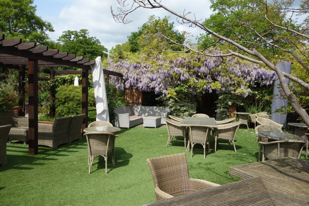 OUTDOOR SEATING: The main cafe / restaurant has a good sized outdoor seating area next to a large pond and with attractive plants in the background. which is not covered but has plenty of large umbrellas.
