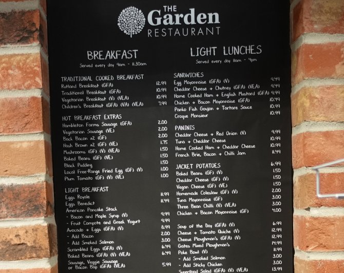 FOOD TYPE: Up market garden centre type food. Everything from a coffee to a full main meal. Breakfasts are also included.