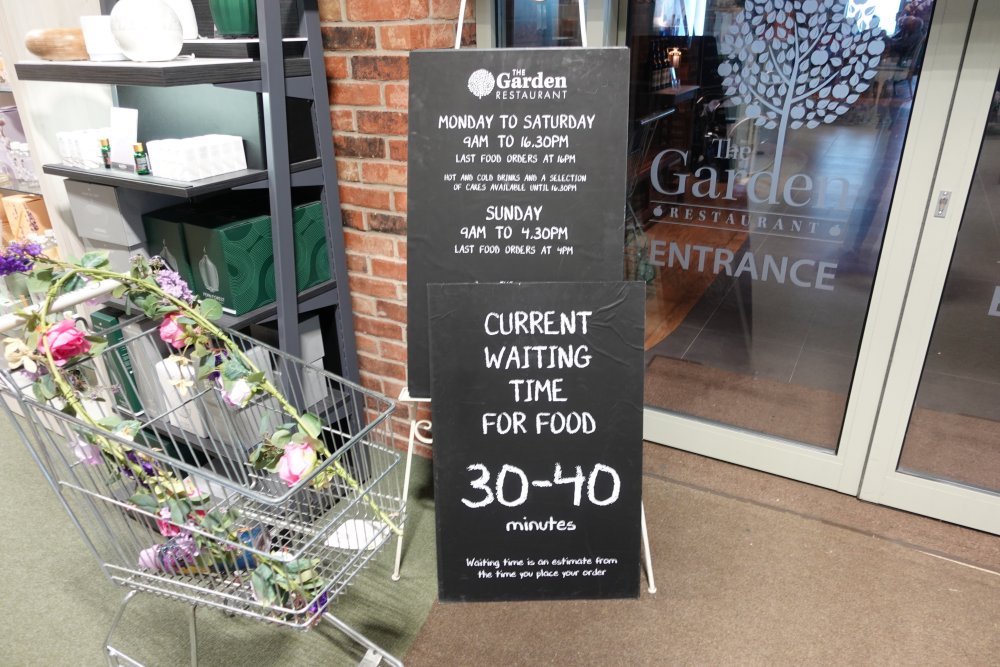We didn't have time to test out the main restaurant but there are some rather unflattering reviews left on Trust Pilot about it. Waiting times do seem to be a problem with the sign outside the door quoting an estimated wait of 30 to 40 minutes after food has been ordered (see the picture below). This is not acceptable for a garden centre restaurant.