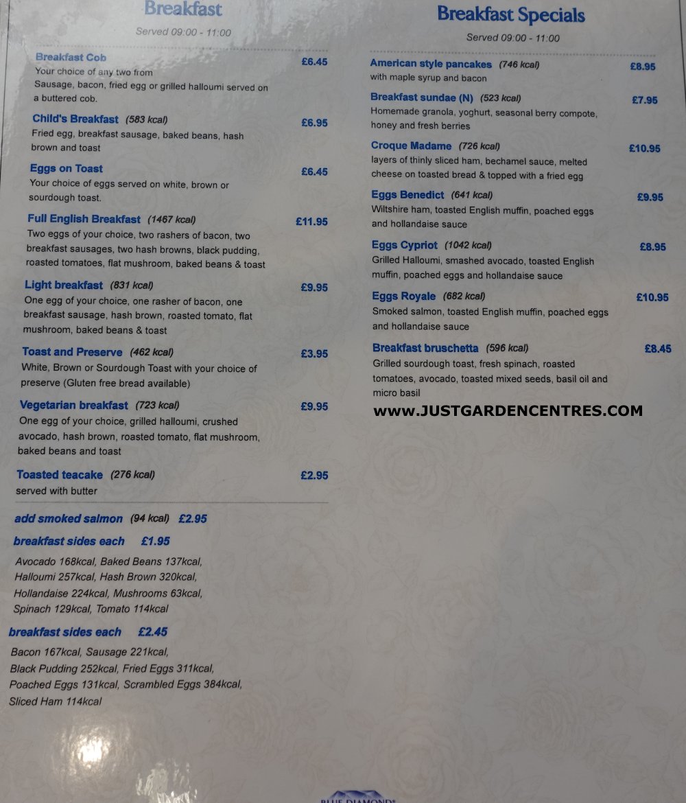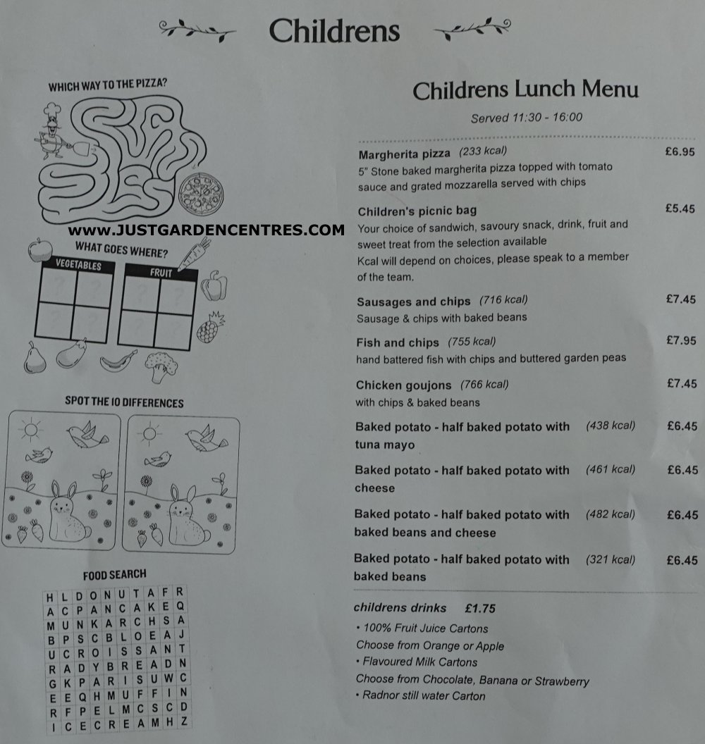 FOOD TYPE: The cafe serves standard type food for a garden centre. Breakfast service ends at 11.00, lunch service begins at 11.00 / 11.30 / 12.00 depending on the meal type and the children's menu begins service at 11.30. Slightly over complicated timings. Our pictures of the menus below give a better idea of the food on offer.
