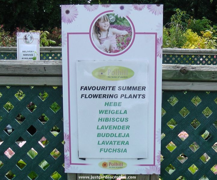 THE OUTSIDE AREA Not many garden centres have the knowledge or time to provide a real planted area but at Polhill they have done exactly this using a large raised bed. It's impressive to see real planting in a garden centre rather than just rows upon rows of potted plants. The paths are wide and kept commendably clear and clean, more than enough room for wheelchair access. The surface of the paths is predominantly tarmac and although there are two small sets of stirs in the area there is also side access via a shallow side-ramp. Even though the area is not huge we found the lack of large signs made it difficult to locate particular plants. yes there were signs but only really visible visible when you were near them. And the plant groupings were sometimes a bit unusual with, for example, weigela, hebe, hibiscus, lavender, budleia, lavatera and fuchsias being grouped together away from the main shrubs. Plants within groups however were in alphabetical order.