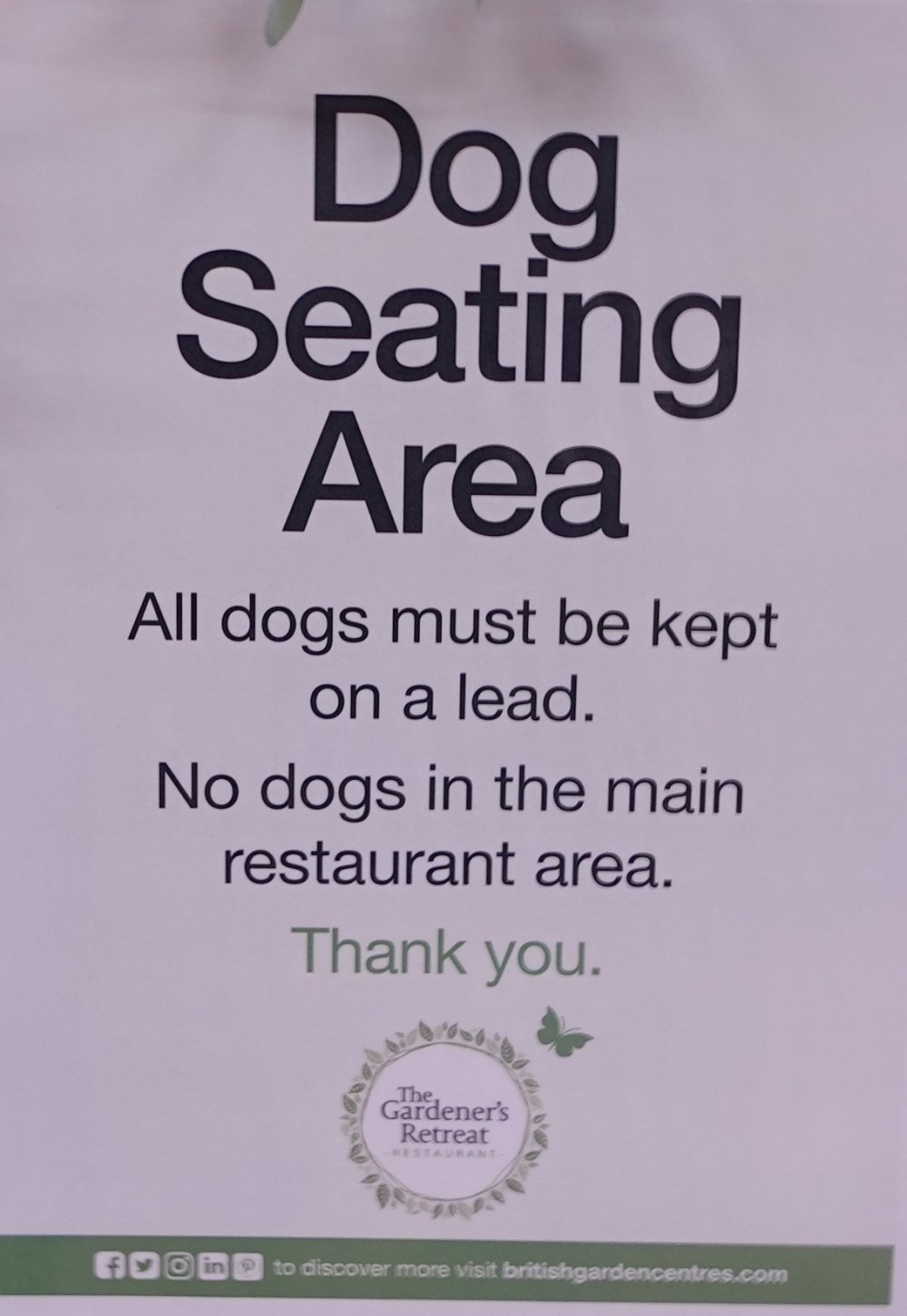 IS SHINFIELD GARDEN CENTRE DOG FRIENDLY? Yes, Shinfield Garden Centre is dog friendly, so feel free to bring your dog along. They are permitted all around the garden centre and even the cafe. The notice in the cafe (see the picture below) does ask you to sit with your dog in the dog seating area which is under cover.