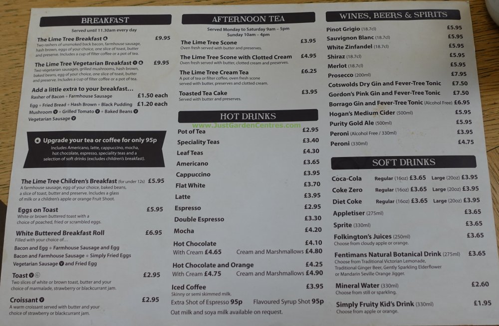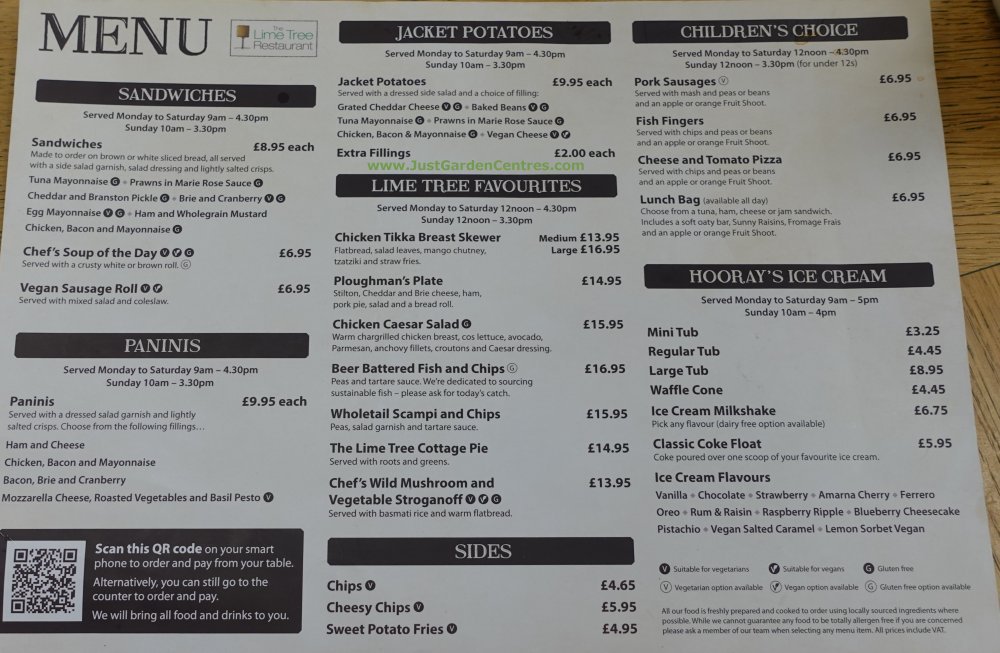 FOOD TYPE: A typical garden centre menu serving sandwiches, paninis, jacket potatoes soup of the day and side dishes. These are served from 9am to 4.30pm daily (10am to 3.30pm on Sundays). They also offer a choice of seven main meals from 12noon to 4.30pm daily (12noon to 3.30pm on Sundays) and children have their own main meals.